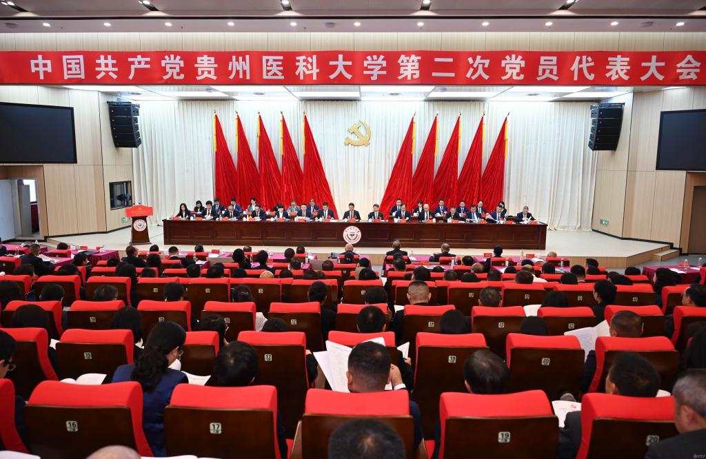 会场内气氛庄严热烈。主席台上方悬挂着“中国共产党贵州医科大学第二次党员代表大会”的会标,镰刀锤头组成的中国共产党党徽悬挂在正中,熠熠生辉;十面鲜艳的红旗分列两侧,交相辉映。会场内悬挂“凝心聚力担使命,砥砺奋进谱新篇,为建设特色鲜明、同类先进、国内一流的高水平医科大学而团结奋斗!”的主题横幅。